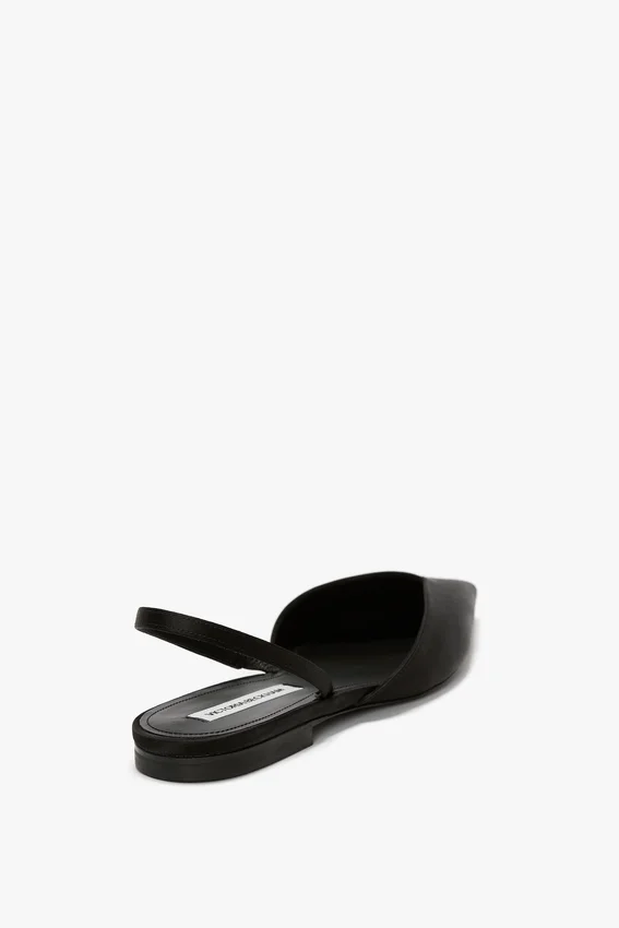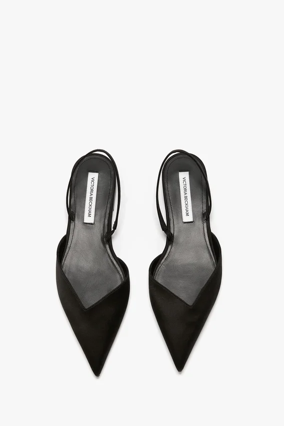 Der aus Satin gefertigte und mit Leder gefütterte Victoria Angle Halter Back Flat in klassischem Schwarz verfügt über eine markante spitze Zehenpartie und einen eleganten Fersenriemen. Eine gepolsterte Innensohle sorgt für zusätzlichen Komfort und garantiert Tragekomfort den ganzen Tag über.